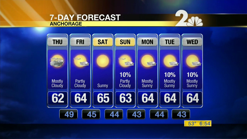 We stay mostly cloudy Thursday after some early morning sprinkles with a high of 62 to 63 degrees and a low of 49 in Anchorage along